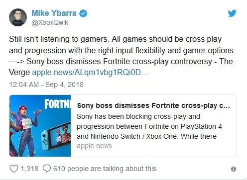 针对吉田健一郎的这一番表态,Xbox 的工程主管 Mike Ybarra 在推特上发文直言索尼在处理跨平台联机的事情上,“依旧没有倾听玩家的意见”。