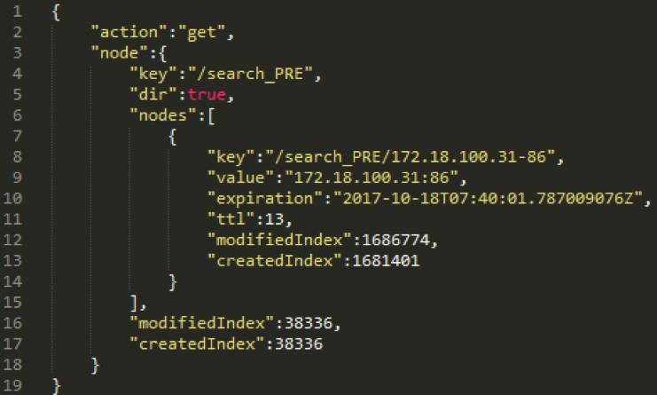可以看到我是使用get方法向etcd发送请求的,请求的是部署在预发环境(PRE)的搜索服务(search);在它的根目录“/search_PRE”下,仅存储了一个应用实例的信息,这个实例的key是“172.18.100.31-86”;对应的value是“172.18.100.31:86‘’,整个注册过程是这样的: