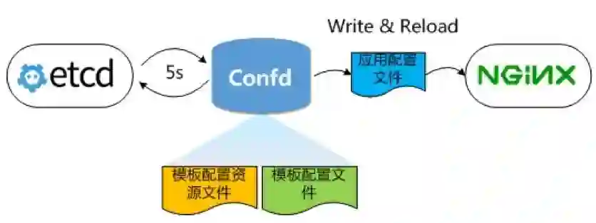 通过supervisor管理confd进程。confd在运行后会每隔5秒对etcd进行轮询,当某个应用服务的K/V更新后,confd会读取该应用存储在etcd中的数据,写入到模板配置文件中,生成这个应用配置文件,最后由confd将配置文件写入到目标路径下,重新加载nginx程序使配置生效。(代码请参考:https://zhuanlan.zhihu.com/idevops)