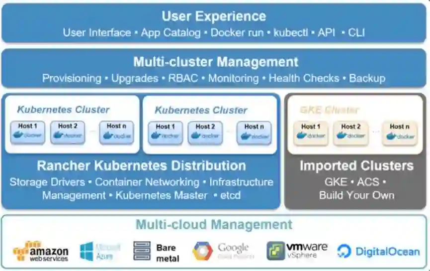 Rancher图形化管理界面,部署简单、方便, 可以与AD、LDAP、GITHUB集成,基于用户或用户组进行访问控制,快速将系统的编排工具升级至Kubernetes或者Swarm,同时有专业的技术团队进行支持,降低容器技术入门的难度。