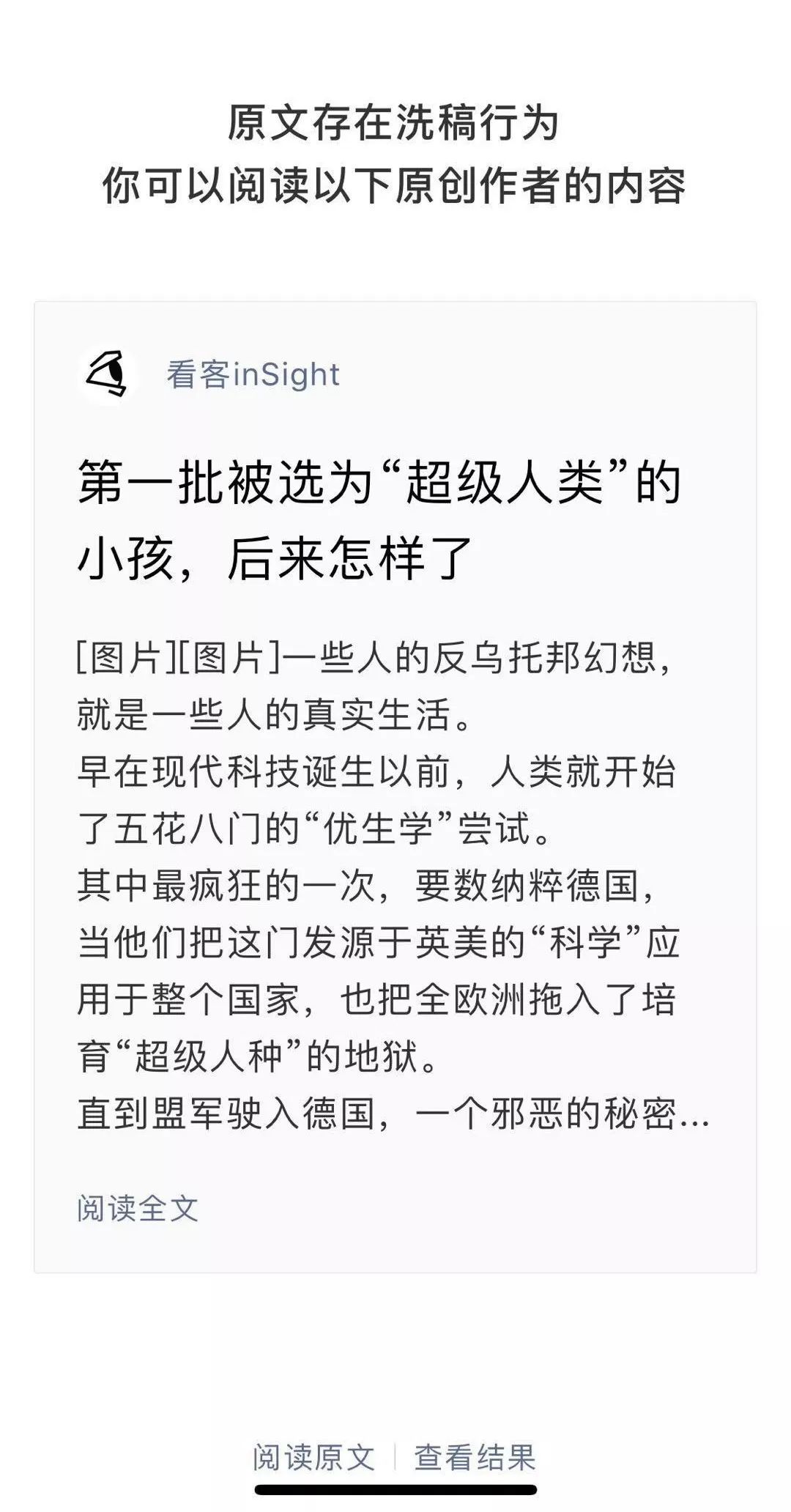 他尤其欣赏“文章被判定为洗稿后,被投诉文章链接将直接被替换为原文”的惩罚方式:“我觉得这对于写字的人来说是一种挺大的羞辱,明晃晃的羞辱。”