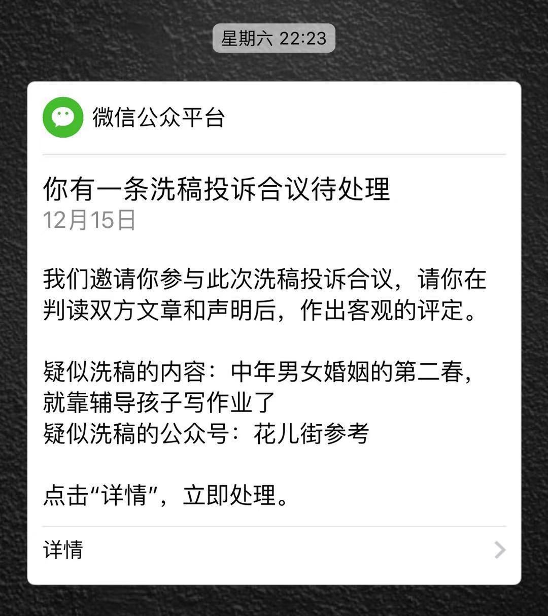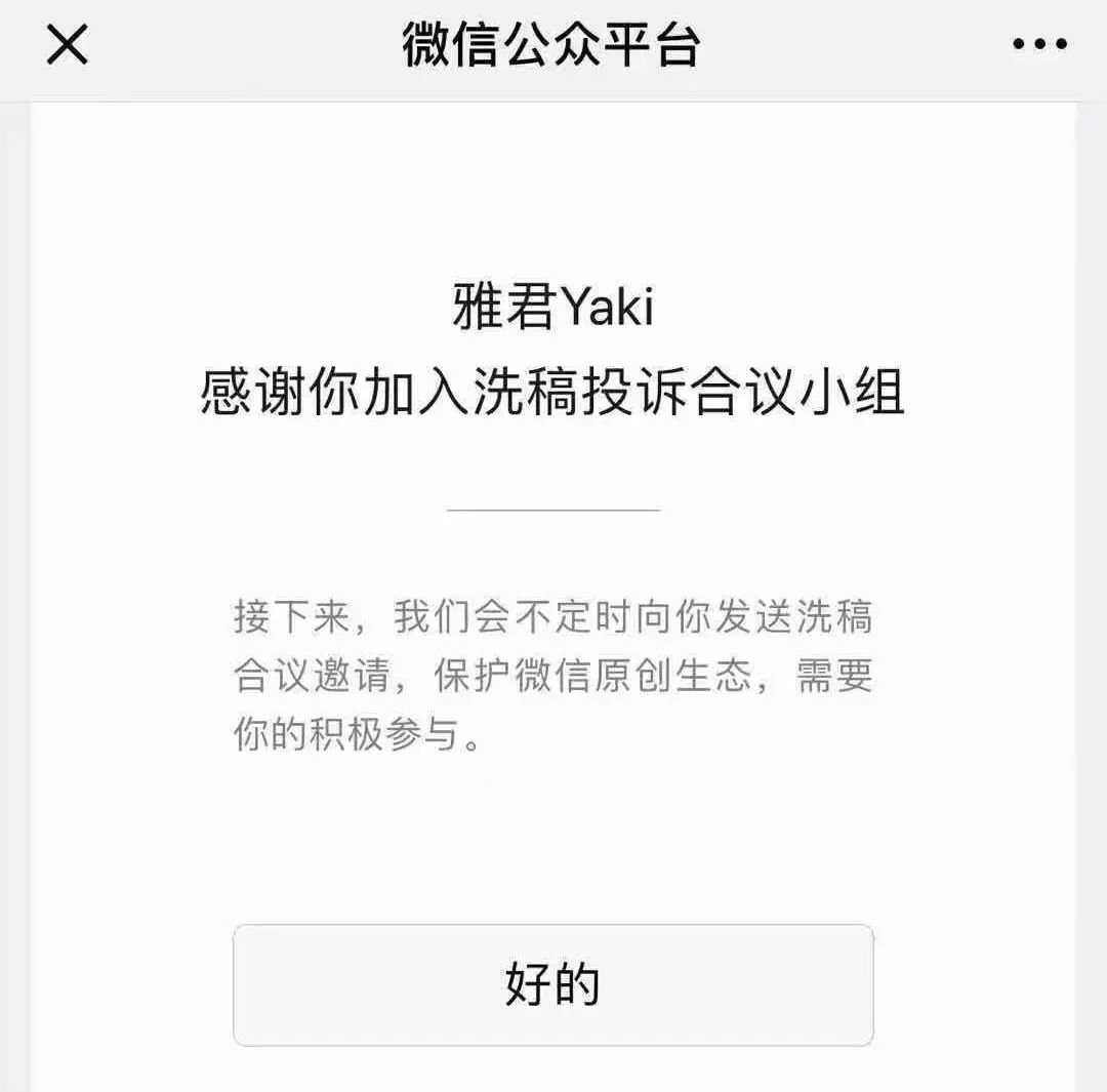 12月3日下午,雅君的微信突然弹出一条消息,她一眼扫到了“洗稿投诉”四个字,先是被“投诉”这词“吓得一哆嗦”,心想最近也没写什么敏感内容,怎么会被人投诉,还是“洗稿投诉”,心想“哪个孙子在诬陷我”。仔细一看,才发现是微信邀请她加入洗稿投诉合议小组的通知。