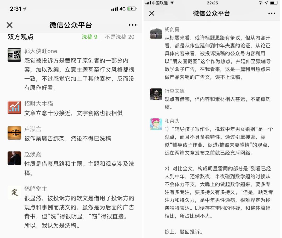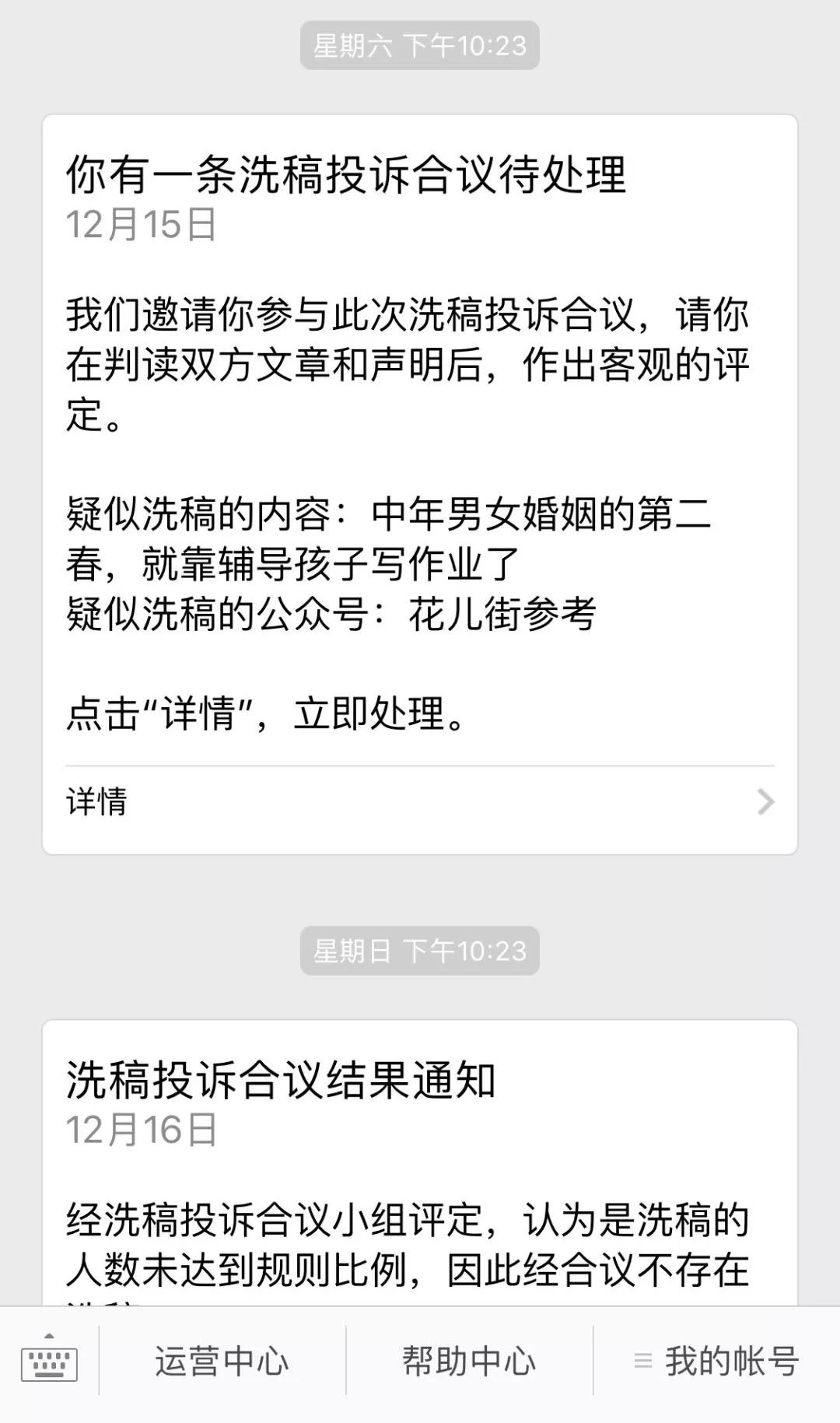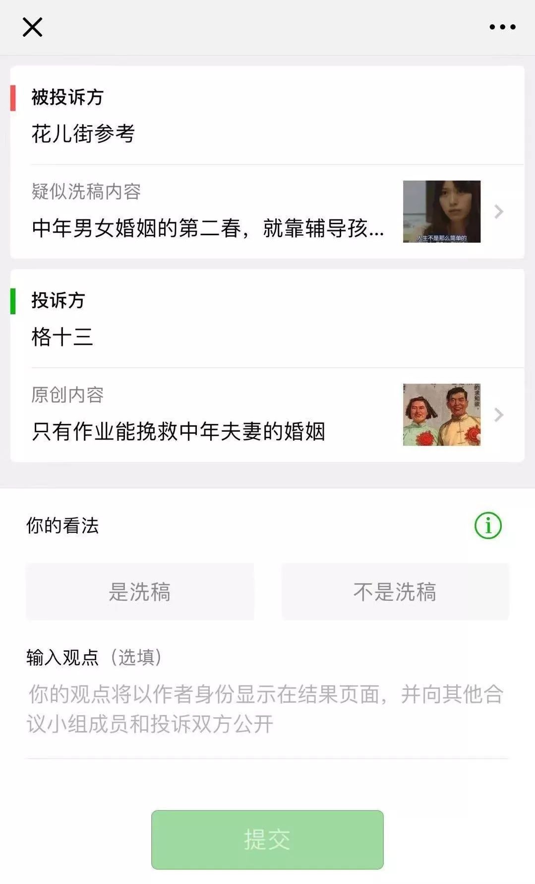无独有偶,他也和雅君一样以为自己被投诉了。仔细一看才明白是微信邀请他参与评议某篇文章是否洗稿。