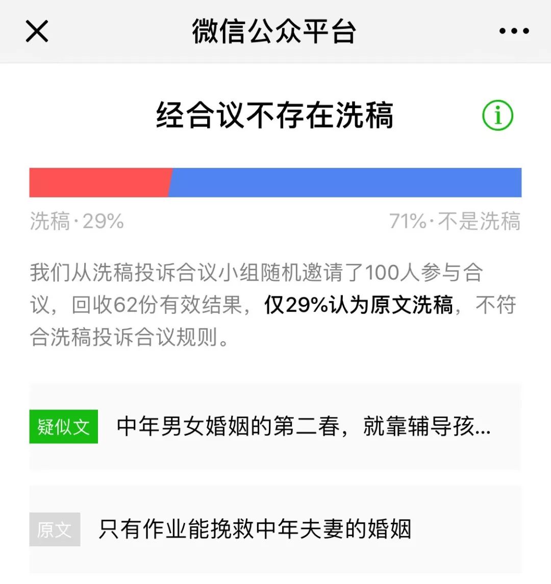 最终,十三姐发起投诉显示的结果是:微信从洗稿投诉合议小组随机邀请了100人参与合议,回收62份有效结果,仅29%认为原文洗稿,不符合洗稿投诉合议规则,最终判定不是洗稿。