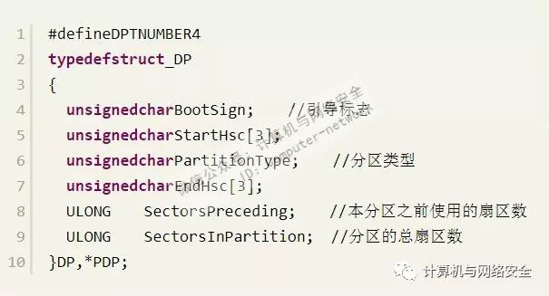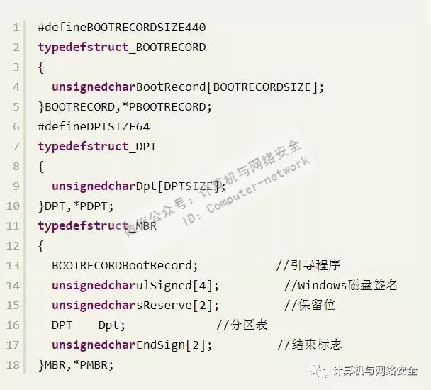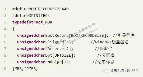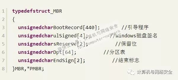 下面介绍如何将MBR的信息定义成一个个的结构体。通过前面用WinHex对MBR的手动分析,我们了解到MBR分为五部分,并且知道每部分占用的字节数。因此,可以将MBR定义为如下: