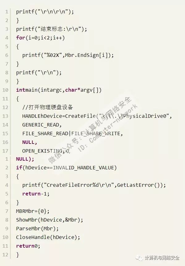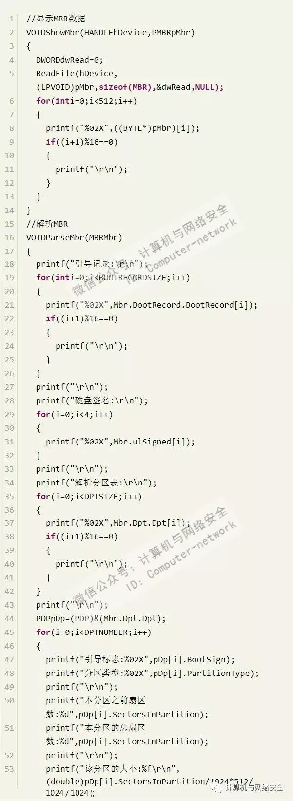 到了这里大家可能会觉得通过程序解析MBR已经不是问题了,下面直接提供程序的代码吧。如果代码中有不理解的地方,可以参考一下我们是如何通过WinHex对MBR的解析了。代码如下: