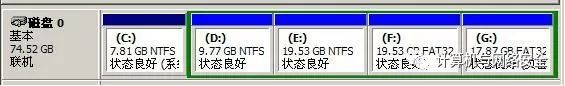 从图7中可以看出,在磁盘上,D盘、E盘、F盘、G盘的周围有一个绿色的框,这个框就表示为扩展分区。