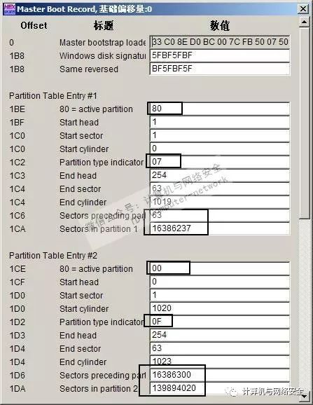 在图5中被选中的位置就是Windows的磁盘签名,它的位置在紧接引导程序的第4个字节。Windows磁盘签名对于MBR来说不是必须的,但是对于Windows系统来说是必须的,它是Windows系统在初始化时写入的,Windows依靠磁盘签名来识别硬盘,如果该签名丢失则Windows认为该磁盘没有被初始化。在图5中,Windows的磁盘签名为“0xBF5FBF5F”。