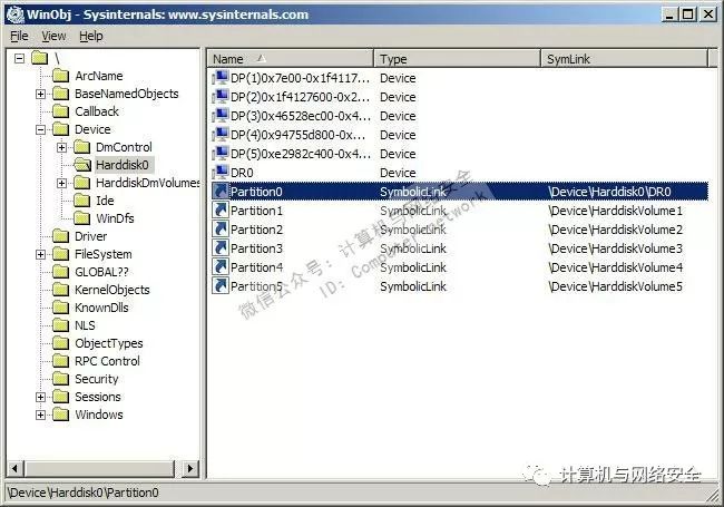 通过图11可以找到硬盘设备的设备名,例如可以通过\Device\Harddisk0\DR0这个设备名再去查找相应的设备符号链接。我们再依次打开WinObj左边的树形控件,如图12所示。