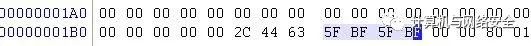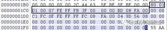 在MBR中还有最后一个内容,如图6所示。在图6中紧接着DPT后面的两个字节就是MBR中最后的两个字节。这两个字节是MBR的结束标志,用“55AA”表示。引导程序会判断MBR扇区的最后两个字节是否为“55AA”,如果不是则报错。