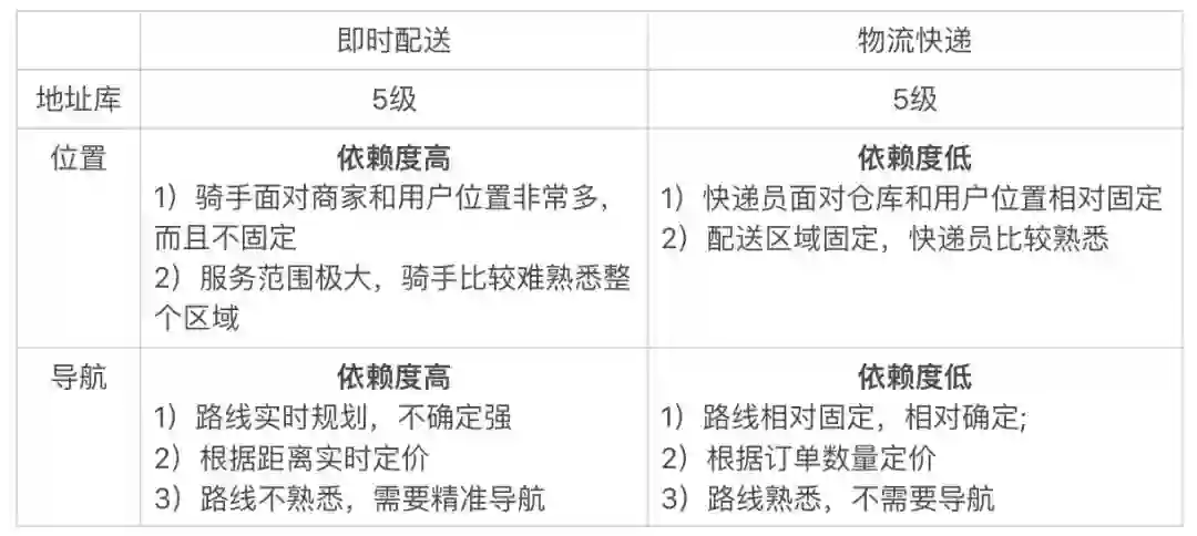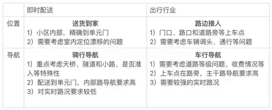 - 正确的位置 - 实时部分:骑手实时位置。 - 静态部分:用户和商户准确的地址和位置。 - 正确的导航 - 两点之间正确的距离和路线。 - 突发情况的快速反应(封路、限行)。