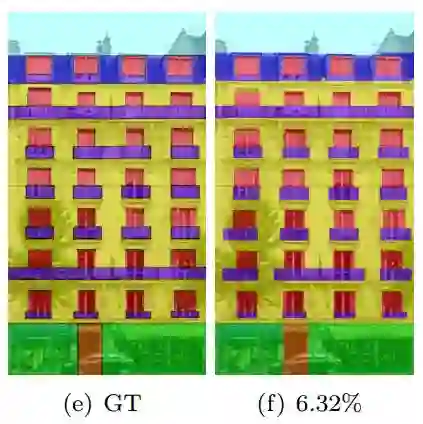 本文所展示的另外一组实验数据。Original是原始数据,Inpainted是根据对称信息去除遮挡的立面影像。(e)GT是真实语义分析结果,(f)是本文的语义分析方法错误百分比。