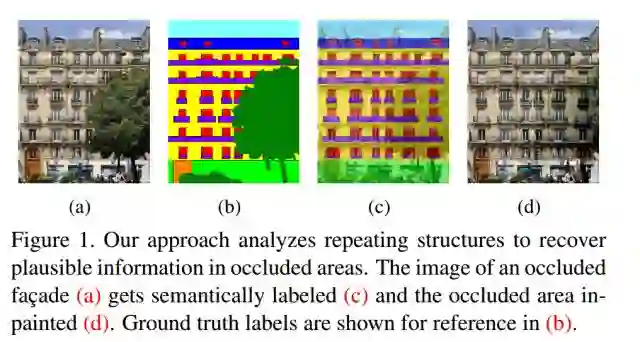 下图展示了本文利用建筑物里面的额对称信息对遮挡区域进行恢复,并进行语义分析的一个效果图。