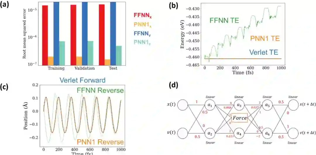 由 p = 1 的遗传优化产生的 PNN 比架构复杂的 FFNN 更准确地再现训练、验证和测试数据。值得注意的是,最佳 PNN(PNN1)还具有出色的长期能量守恒和时间可逆性。PNN1 学习了时间可逆性和总能量是一个运动常数。这与物理不可知的 FFNN 甚至像一阶欧拉积分这样的基于物理的简单模型形成鲜明对比。
