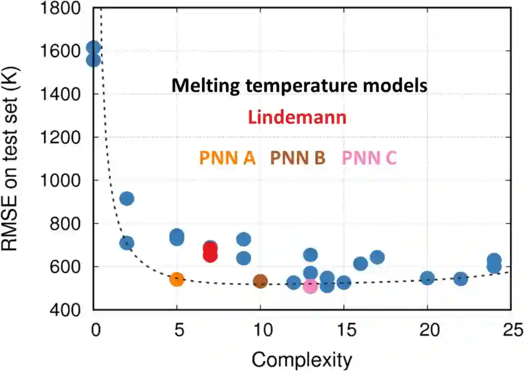 PNN 模型代表了准确性和简约性之间的各种权衡,从中我们可以定义最佳模型的帕累托前沿。PNN 方法找到了几个简单而准确的表达式。最简单的非平凡关系由 PNN A 给出,它近似熔化温度与德拜温度成正比: