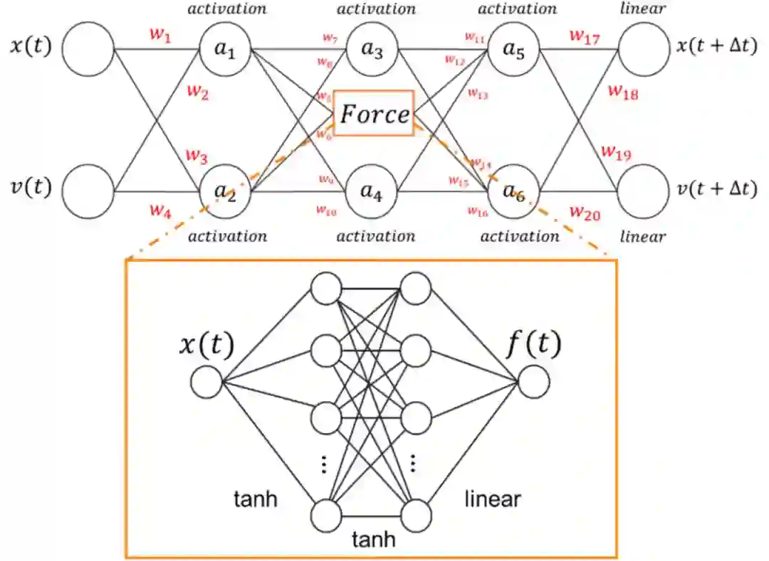 在第二个例子中,PNN 学习经典力学,摩擦力与速度成正比,并基于位置 Verlet 方法发现相同的稳定积分器,全部来自观测数据。