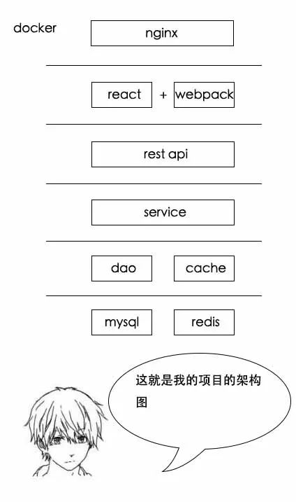 小史:底层mysql是存储,redis是缓存,dao层操作mysql,cache层操作redis,service层处理业务逻辑,rest api层为前端提供rest接口。前端这边用react进行模块化,webpack打包部署。网关nginx进行负载均衡。mysql、redis、nginx和springboot应用都放在docker里部署。