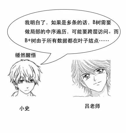 小史:我明白了,如果是多条的话,B树需要做局部的中序遍历,可能要跨层访问。而B+树由于所有数据都在叶子结点,不用跨层,同时由于有链表结构,只需要找到首尾,通过链表就能把所有数据取出来了。