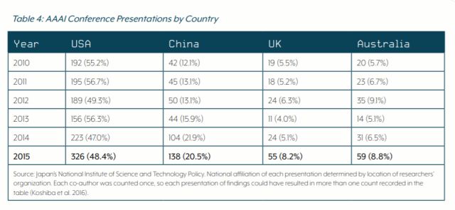 在论文发表数量上,2015年中国学者在AAAI上发表的论文为138项,占据全世界的20.5%;而来自美国学者发表的成果数量为326项,占全世界的48.4%。