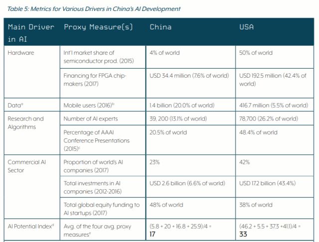 报告据此得出结论,称中国硬件水平远不及美国,已经成为人工智能发展的瓶颈。