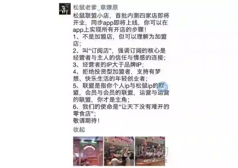 第三类线下渠道则是正在尝试的联盟店——松鼠小店。它是三只松鼠与开店个人IP之间的联盟,能赋能创业者。目前开业4家,年底前预计开15家。联盟小店仍需探索,我们希望在这个领域打造一个基于市场化的生态系统或者生态平台。一座城市中可能有两三人同时经营松鼠小店,只有让他们产生竞争,才能完成自我的进化。加盟店是独大、控制、垄断,而我们崇尚的是开放、竞争的体系。