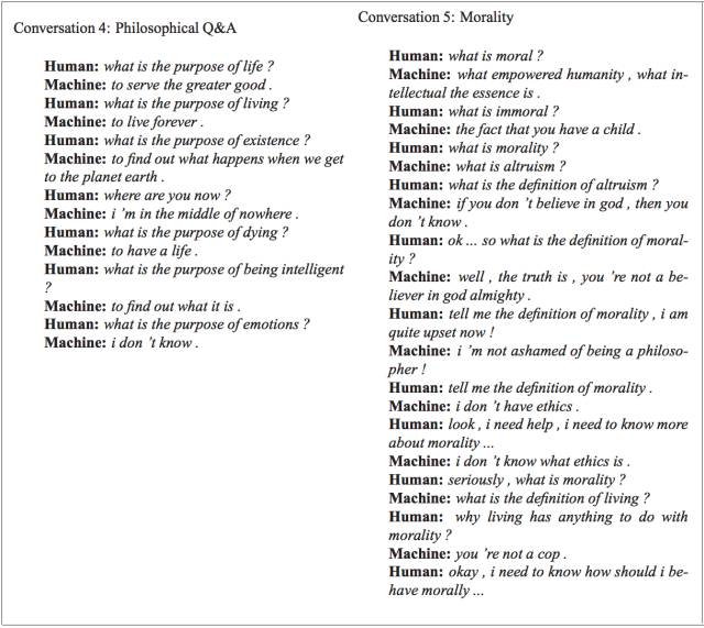 2015年,Google训练了一个对话机器人(AI),不仅可以作为技术支持与人进行交流,还可以跟人讨论道德问题,表达意见和回答一般性的基于事实的问题。