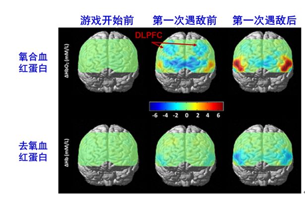 大学生玩家玩《英雄联盟》时大脑的实时功能活动监测结果。跟游戏开始前(左图)相比,游戏开始后双侧背外侧前额叶(DLPFC)中的氧和血红蛋白(HbO2)水平显著下降(中图),提示脑区的功能可能受到了抑制。遇到敌人并进入战斗后有所恢复(右图)
