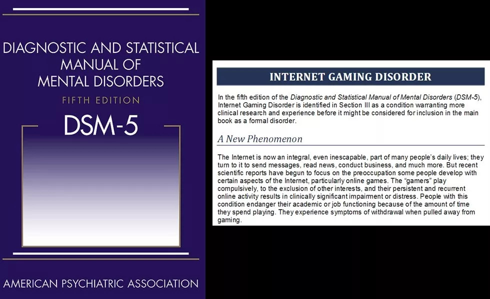 美国精神病协会2013年正式出版的《精神疾病诊断与统计手册第五版》(DSM-5)中将 “网络游戏成瘾”(Internet Gaming Disorder)列为“有待更多研究的情形”