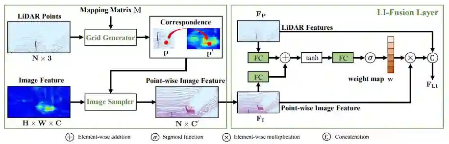 3. 为了减少图像的遮挡以及深度不确定性对融合造成的影响,LI-Fusion layer 利用点云特征估计对应图像特征的重要程度并筛选,具体是将点云特征与图像特征经过若干操作学习得到权重值,权重值与图像特征相乘再与点云特征串联作为最后的融合特征。