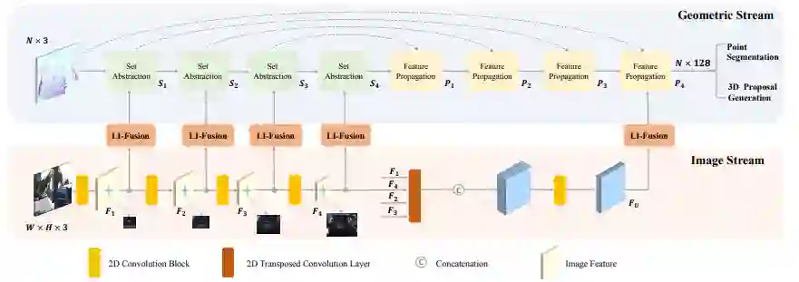 。该研究设计了一个端到端的可学习框架 EPNet 来集成两个组件。在 KITTI 和 SUN-RGBD 数据集上进行的大量实验表明,EPNet 优于当前最优方法。其网络结构点云分支是 point encoder-decoder 结构,图像分支则是一个逐步 encoder 的网络,并且逐层做特征融合。