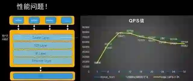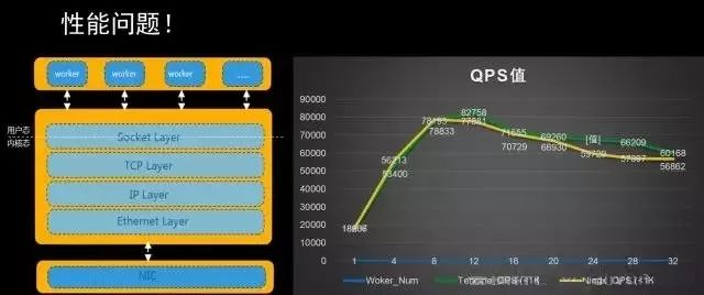 Tengine在应用过程中也遇到了各种问题,最严重的就是性能问题,我们发现随着CPU数量越来越多,QPS值并没有线性提升;Nginx本身是多worker模型,每个worker是单进程模式,多worker架构做CPU亲和,内部基于事件驱动的模型,其本身已经提供了很高的性能,单核Nginx可以跑到1W5~2W QPS。Nginx往下第一层是socket API,socket 往下有一层VFS,再往下是TCP、IP,socket层比较薄,经过量化的分析和评估,性能开销较大的是TCP协议栈和VFS部分,因为同步开销大,我们发现横向扩展不行,对此,我们做了一些优化。