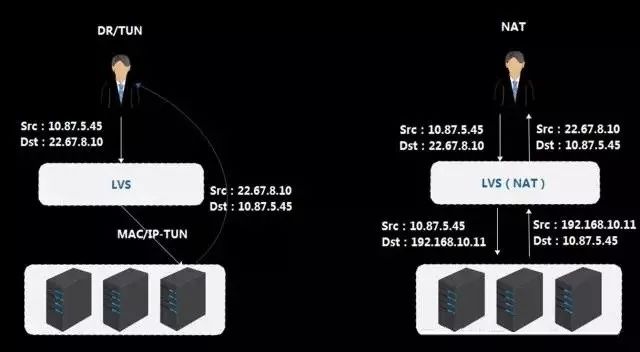 TUN模式走在LVS之后,LVS会在原有报文基础上封装IP头,到了后端RS之后,RS需要解开IP报文封装,才能拿到原始报文,不管是DR模式还是TUN模式,后端RS都可以看到真实客户源IP,目的IP是自己的VIP,VIP在RS设备上需要配置,这样可以直接绕过LVS返回给用户,TUN模式问题在于需要在后端ECS上配置解封装模块,在Linux上已经支持这种模块,但是windows上还没有提供支持,所以会对用户系统镜像选择有限定。