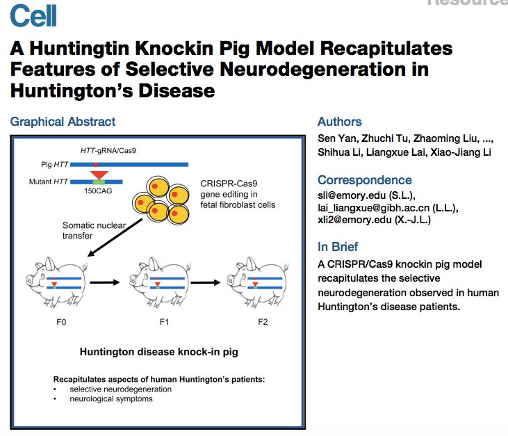 首次利用基因编辑技术和体细胞核移植技术,成功培育出世界首例亨廷顿舞蹈病基因敲入猪