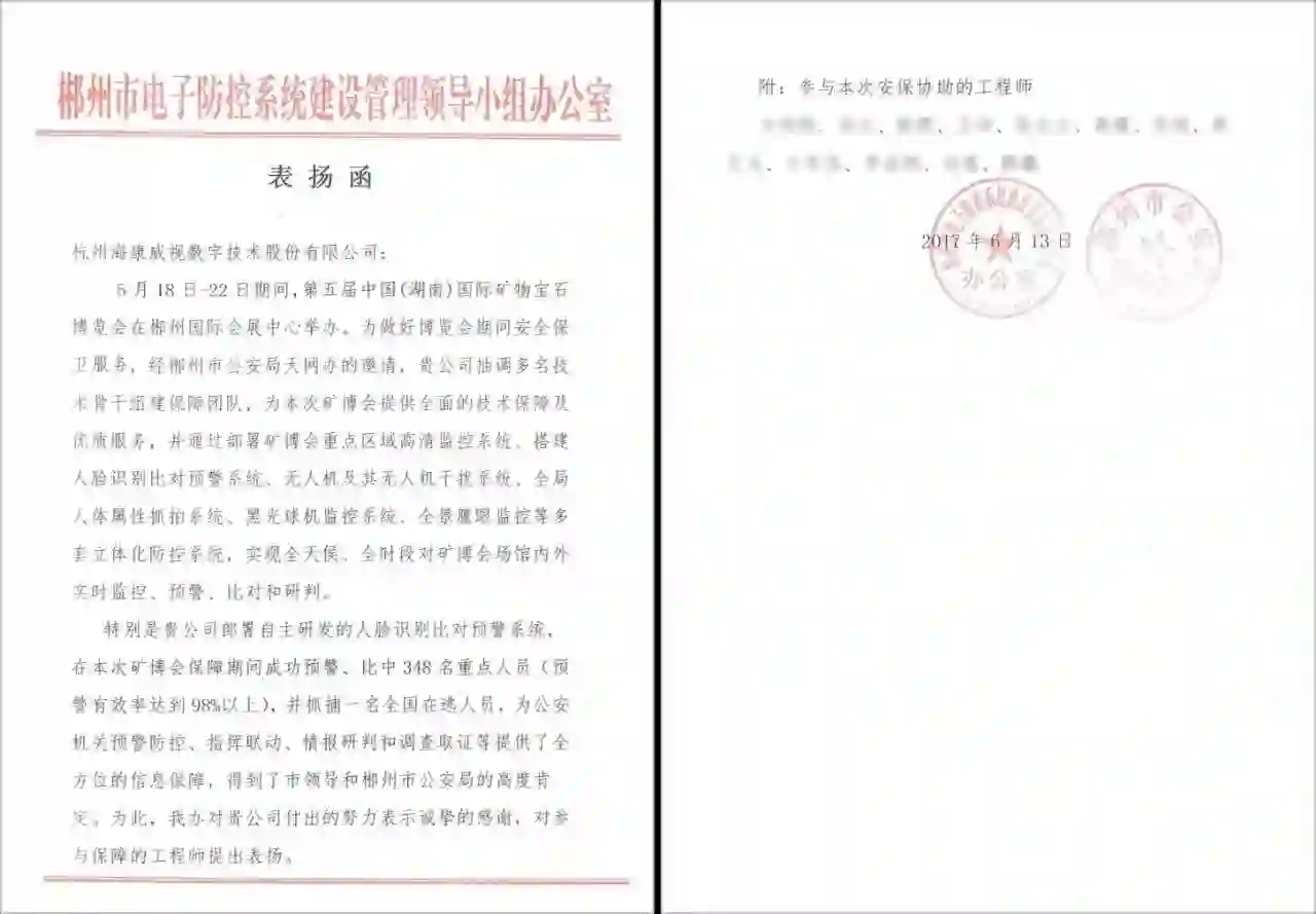 5月18日至22日,在“矿晶之都”湖南郴州举行的第五届中国(湖南)国际矿物宝石博览会期间,当地公安部署的海康威视人脸识别系统发挥了关键作用。在保障期间,系统成功预警、比中348名重点人员(预警有效率达到98%以上),并协助公安成功抓捕一名全国在逃人员。
