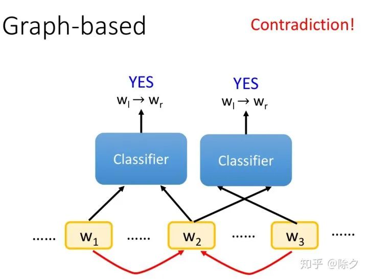 但如果我们把判断有无关系和判断关系是什么分开来处理,会容易出现矛盾的情况。比如 w1和w2之间有w1->w2的依存关系,而w2和w3又有w3->w2的依存关系。这样就会出现一个 token 入度是2的不可能情况。