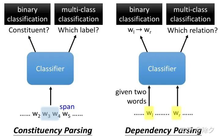 我们要怎样得到这样一棵依存解析树呢?实际上丢给分类器两个词汇和其上下文,它会先通过一个二分类器,用来输出左边到右边的token之间有无依存关系,若有依存关系,则第二个分类器会输出其关系的类别。