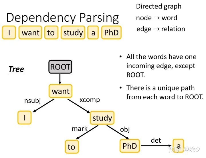 更具体地说,依存解析做的是把一个句子,变成一个有向图。图中每一个节点是一个词汇,每一条边,是一种关系。除了根节点,每一个节点词汇都只有一个入度的边。但每个词汇都可以指向多个其它词汇。它是一个树状的结构。每一个词汇都有唯一的一条路径回溯到根节点。