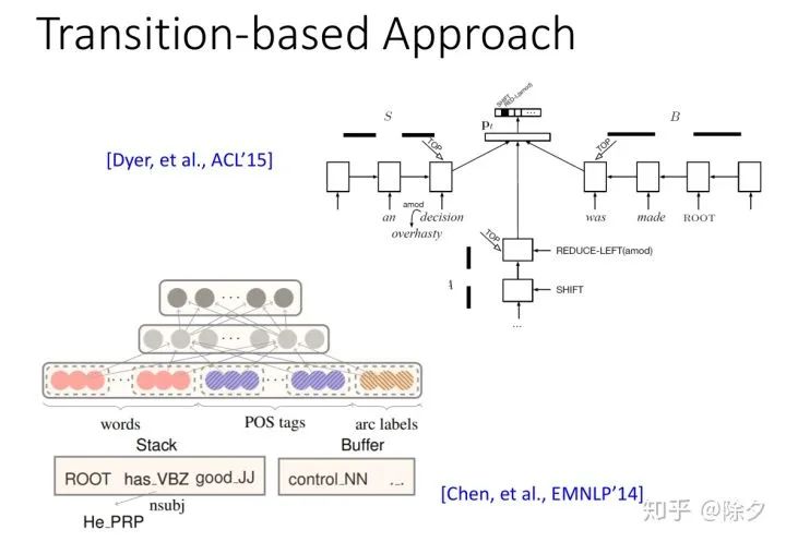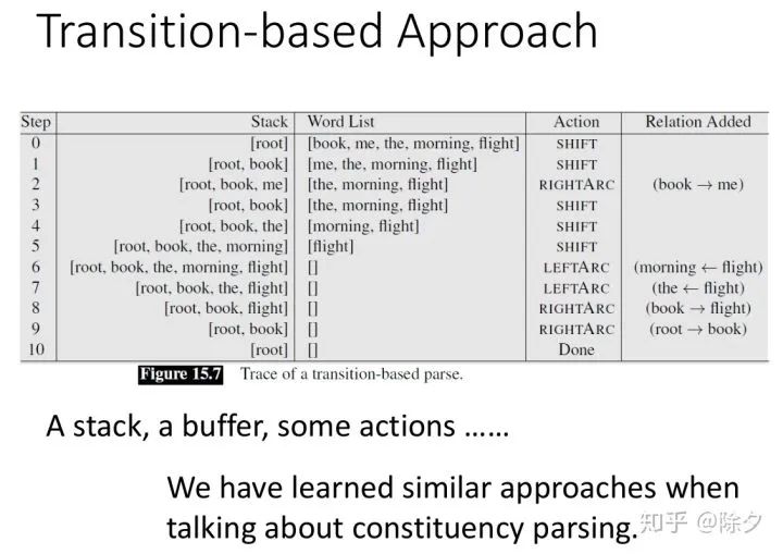 类似的,我们也可以用基于转移的方式来做依存解析。这部分可以参照上一期的 成分句法分析。模型要根据 Buffer 和 Stack 的内容,来决定要采取哪一个 action。