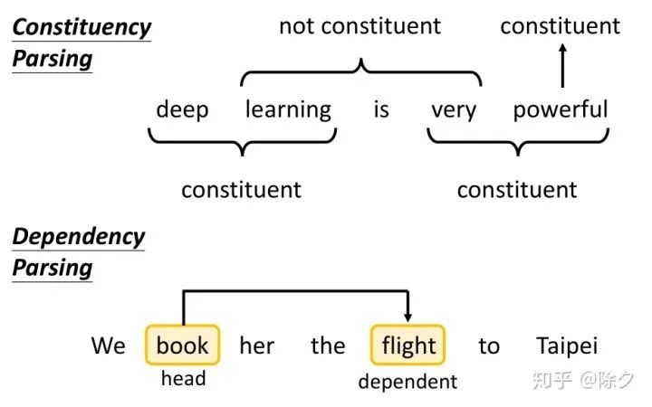 成分句法分析关心的是,某两个相邻词汇能不能接在一起构成成分(广义的mention)。而依存句法分析关系的是,两个词汇之间的关系(entity relation)。依存解析不关心两个词汇是否一定要相邻。比如 book 和 flight 没有直接相连,但是 flight 是 book 的宾语,book 是 flight 的主语。我们会用一个从 book 指向 flight 的箭头来表示这种依存关系。箭头的起始我们叫作 head。