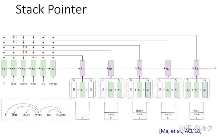 往后基于转移的也有Stack-Pointer Networks。首先,它的输入是字嵌入,用 CNN + pooling 处理后,与词的嵌入拼接起来喂给 BiLSTM。一开始 "$" 作为根节点,放入栈中。栈中只有一个元素,位于栈顶,模型要判断 "$" 指向句子中的哪个词,即 head。"$" 没有兄弟节点和父节点,其嵌入会用单方向的 LSTM得到隐层,再用 pointer network 计算该隐层与其余单词的得分。