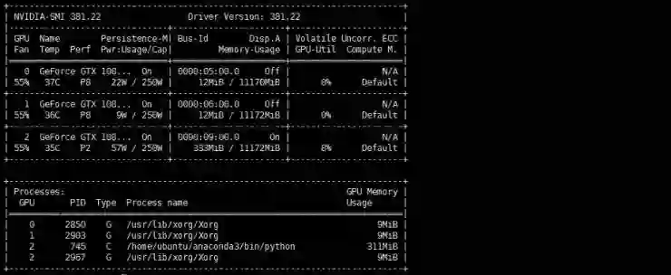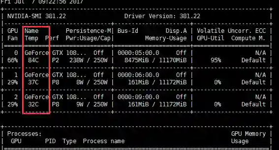 这里用的是2卡进行计算测试,我们可以看到,2卡的Perf(性能)一项已经被调整为“P2”(其它卡仍为P8),2卡的温度为35度,而且三个风扇的速度均为55%。“P2”指的是nvidia的显卡power state,从P0到P12,最高性能状态为P0,运行计算是为P2,最低功耗(最低性能)为P12。