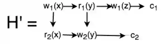 调度器调度所有事务操作执行的结果,称作操作执行的历史(history)。直观的说,执行历史给出了事务集合中的所有操作,最终按照什么顺序执行的,是调度器工作的结果。在执行历史中,原有事务内的操作相对顺序将不变。事务之间的冲突操作,在执行历史中会给出明确的顺序关系。