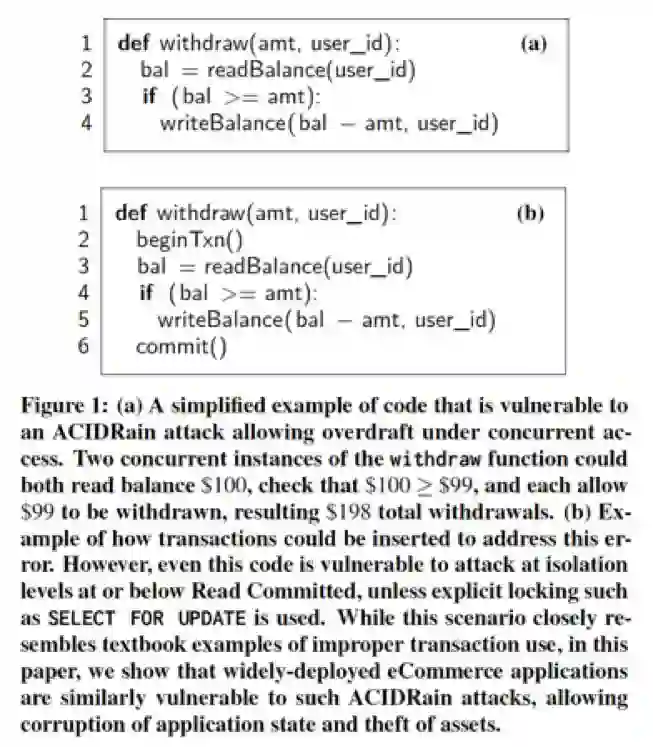 这一起攻击事件中的漏洞是由于处理数据并发访问不当而造成的。无独有偶,今年(2017年)的另一份测试报告(酸雨测试)显示,12家重要的电商Web平台(提供电商WebApp部署到用户环境,包括开源和商业的形式),在使用低于可串行(serializable)隔离级别的数据库时,都存在处理并发请求不当而造成的各种漏洞。诸如在结算时被偷取商品,重复使用礼品卡、优惠券,破坏库存数据等等。这12家电商平台的使用非常广泛,在超过200万的网站上部署,在所有电商类Web站点中的覆盖率超过50%。