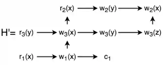 有了操作的完整执行历史的准确定义后,操作执行历史的准确定义为:一个事务集合T=(T1,T2...Tn)的执行历史,是其完整执行历史的一个偏序前缀。直观的理解,操作执行历史是完整执行历史执行过程中的一个中间状态。完整执行历史表示了所有事务全部执行完成的全过程,执行历史则可以表示完整执行历史执行过程中的某个状态。