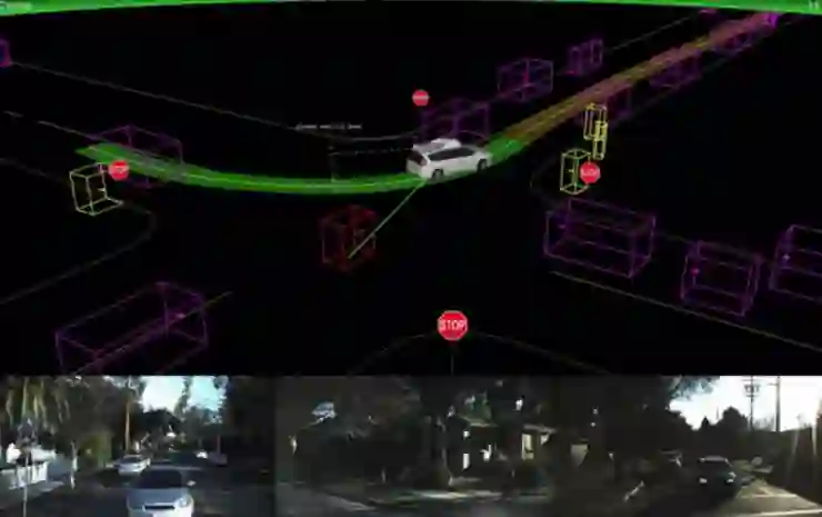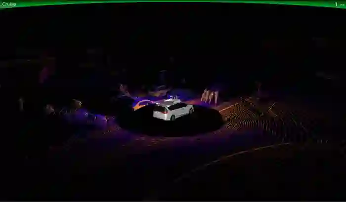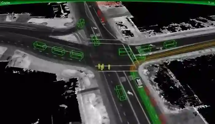 对于人类眼睛来说,能从屏幕上获取的信息并不多:也就是几条简单的线勾勒出了道路的结构和大背景。在这个虚拟的环形交叉路口,我们可以看到一辆中等分辨率的具备自动驾驶功能的克莱斯勒 Pacifica 车型,而一个简单的线框构成的立体盒子代表的则是另外一辆车。