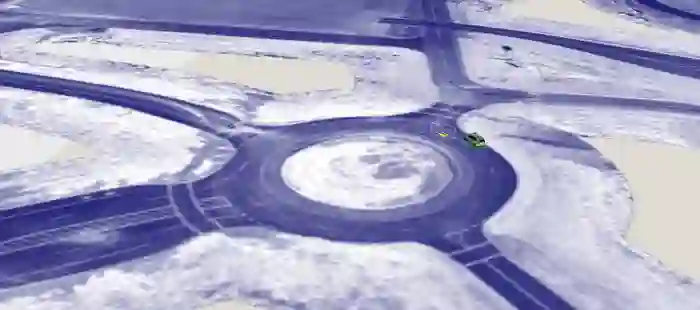 这个模拟的环岛其实是因为此前他们的自动驾驶团队在德克萨斯州奥斯汀遇到过这样一个多车道的环岛,所以为了让自动驾驶系统能学会处理这样的道路模型,便在此地搭建了这样一个模拟环岛。