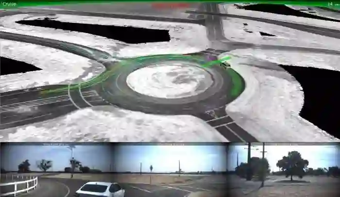 而我(文章作者 Alexis C. Madrigal)现在看到的则是整个学习过程的第三步:真实环境驾驶的数字化、图像化呈现。在这一步,一个单一的驾驶行为(如在环岛的超车行为)可以被发散成上千种模拟场景,用来探测自动驾驶汽车能力的边界在哪里。