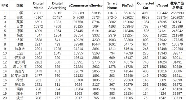 2019年全球数字产业规模排名TOP20(单位:百万美元)