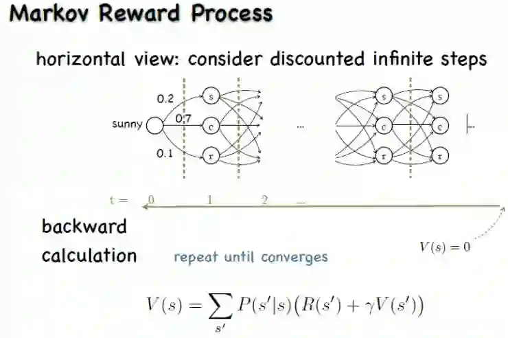 这是走T步的,还有走无穷多步的。我们假设站在无穷大的最后一个点上,这个点照样每个状态上面的V都是0,然后算无穷大-1步是多少,无穷大-2步是多少,往后退无穷多步。但是算法无法实现这个过程,实际上用算法也不需要退无穷多步,因为存在折扣,即退一定步数以后,这个值就会固定不变。