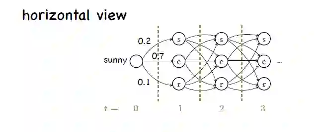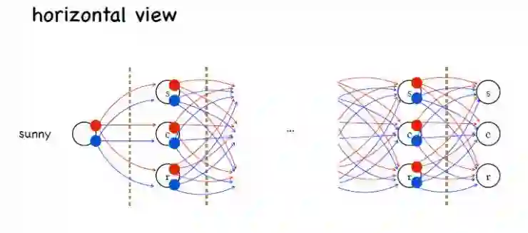 我们还可以从时间的角度来看。比如说现在在某个状态,而到下一时刻,它会根据不同的转移概率转移到不同的状态去。随着时间的变化而转移到下一个时刻的状态去,我们把它称之为水平(horizon)视角。
